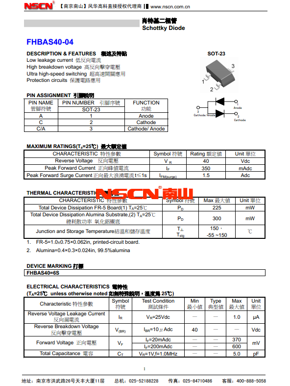 FHBAS40-04二極管參數(shù):反向電壓40V,正向峰值電流350mA,正向最大浪涌電路1.5A。總耗散功率300mw