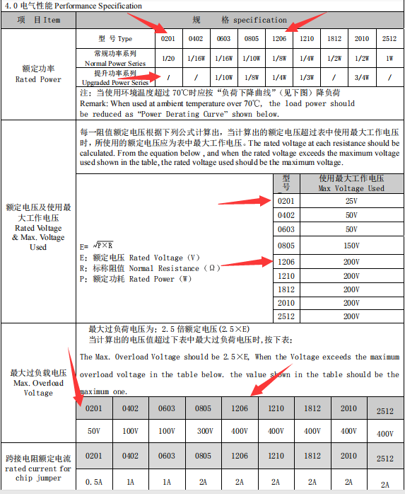 如上圖所示,0201貼片電阻的常規(guī)功率是1/20W,沒有提升功率,1206貼片電阻的常規(guī)功率是1/8W,提升功率是1/4W,0201貼片電阻的額定電壓及使用的最大電壓是25V,而1206貼片電阻的額定電壓及使用的最大電壓是200V,這里要注意的是當(dāng)計(jì)算出來的額定電壓超過上面的最大電壓的時(shí)候,應(yīng)當(dāng)使用上面的最大電壓定為額定電壓。0201最大過負(fù)載電壓是50V額定電流是0.5A,1206的最大過負(fù)載電壓是400V額定電流是2A.。