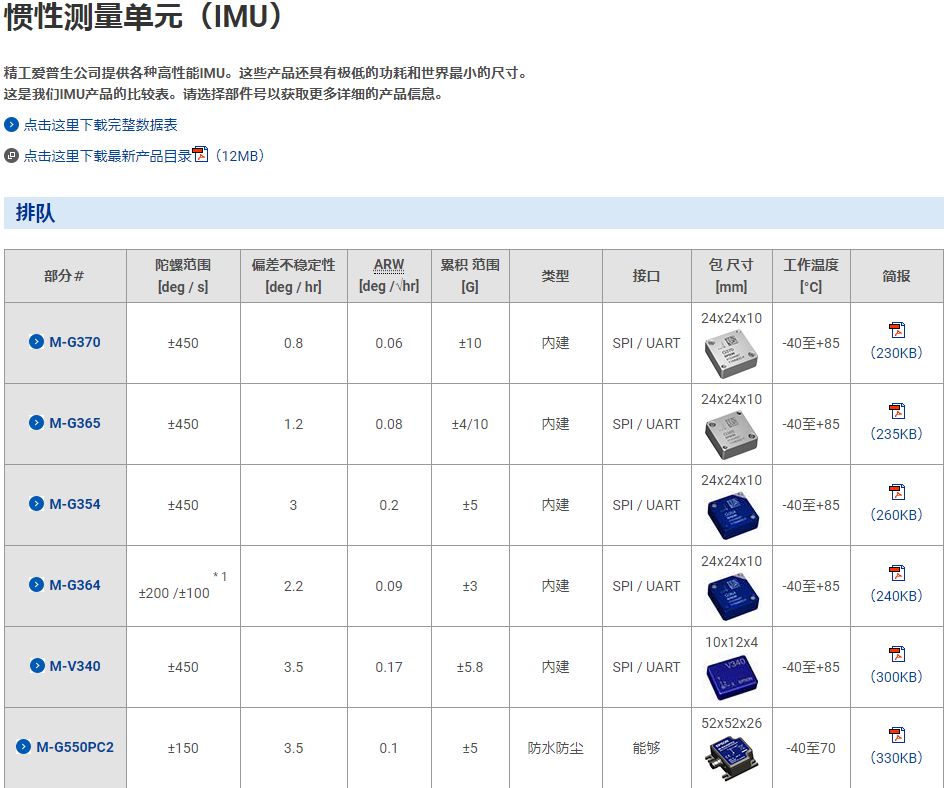 近日,愛普生推出了六軸陀螺儀的全新型號(hào):M-G325。M-G325是一款性能達(dá)到光纖陀螺儀(FOG)級(jí)別的高性能慣性測(cè)量單元,六軸陀螺儀M-G325將成為愛普生新一代IMU的標(biāo)準(zhǔn)。M-G325采用了最新開發(fā)的高性能傳感器,具有穩(wěn)定性更好、噪音更低、動(dòng)態(tài)范圍更廣的優(yōu)越特點(diǎn),而且動(dòng)態(tài)性能出色(比例因子非線性),非常適合諸如汽車、無人飛機(jī)等從靜態(tài)到高速運(yùn)動(dòng)的高精度測(cè)量。早在2011年,愛普生就發(fā)布了旗下首款IMU,可以正確檢測(cè)出包含從微小的傾斜到大范圍動(dòng)作在內(nèi)的慣性運(yùn)動(dòng)信息。自此,愛普生慣性測(cè)量單元便在航空航天以及工業(yè)產(chǎn)品中得到了廣泛應(yīng)用,并因杰出的質(zhì)量和性能而贏得高度贊譽(yù)。隨著自主精密農(nóng)業(yè)機(jī)械、智能施工機(jī)械和無人機(jī)應(yīng)用的快速發(fā)展,小型高性價(jià)比、高精度定位裝置的需求與日俱增,而愛普生最新開發(fā)的六軸陀螺儀M-G325憑借出色的表現(xiàn)為自動(dòng)駕駛和導(dǎo)航提供FOG級(jí)性能。愛普生MEMS六軸陀螺儀FOG光纖陀螺儀相比從性能參數(shù)看非常接近,特別是EPSON最新推出的M-G325等系列參數(shù)已經(jīng)達(dá)到了FOG戰(zhàn)術(shù)級(jí)性能水平,但其成本卻比MEMS低出數(shù)倍。如果可以使用GNSS,而且應(yīng)用的目的是在開放天空環(huán)境中運(yùn)行,六軸陀螺儀可以取代OG光線陀螺儀。如果應(yīng)用能夠接收車輛或平臺(tái)速度更新,則六軸陀螺儀系統(tǒng)可以達(dá)到與獨(dú)立FOG系統(tǒng)相同的水平。這將迅速加速六軸陀螺儀在自動(dòng)駕駛汽車等領(lǐng)域的推廣應(yīng)用。下面南山電子就給大家匯總下除了M-G325,愛普生之前推出的慣性測(cè)量單元IMU的具體參數(shù)規(guī)格以供大家選型參考: