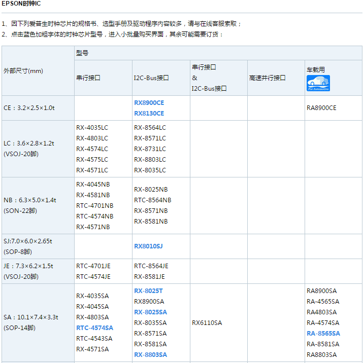 今天給大家匯總一些時(shí)鐘芯片不常用料,如RTC-4543SA等,雖然這些料和時(shí)鐘芯片RX-8025T,RX8010SJ等常用料不能相比,但是有時(shí)候急需卻沒(méi)有貨,屬實(shí)會(huì)讓人著急,舉個(gè)例子,近期疫情之后復(fù)工,南山電子就已經(jīng)賣(mài)出去不少比較不常用的時(shí)鐘芯片。如:RTC-4543SA,RTC-72423,RX-4581NB,RX-8026T,RX-8581SA,RX-4571SA,RA-8565SA,RX-8571LC,RX-8581SA,RX-4803SA,RX-4571SA,RX-4045NB,RX-4803LC,RX-8803LC,RX-4045SA,RA-8565SA,RTC-4543SA,RX-4803SA,RX-8564LC等等。實(shí)時(shí)時(shí)鐘模塊也被簡(jiǎn)稱(chēng)為時(shí)鐘芯片、時(shí)鐘模塊。英文簡(jiǎn)寫(xiě)為RTC,因此也有國(guó)內(nèi)工程師稱(chēng)其為RTC時(shí)鐘。是將32.768kHz石英晶體振蕩器和實(shí)時(shí)時(shí)鐘芯片合為一體的產(chǎn)品,具備振蕩電路、時(shí)鐘功能、日歷功能和報(bào)警功能等。集成了晶體單元就意味著EPSON實(shí)時(shí)時(shí)鐘模塊不需要頻率調(diào)整。愛(ài)普生實(shí)時(shí)時(shí)鐘模塊的產(chǎn)品線實(shí)現(xiàn)了精確計(jì)時(shí)和低功耗,對(duì)于在單機(jī)模式設(shè)備上的應(yīng)用非常理想。相信很多人要問(wèn)了除了RTC-4543SA等這些近期出售的不常用料,是否可以做個(gè)愛(ài)普生時(shí)鐘芯片總表,南山電子滿足您的要求,給大家整理出全部時(shí)鐘芯片的相關(guān)型號(hào)以供大家選型參考: