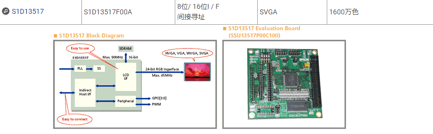 今天給大家介紹愛普生一款帶有外部VRAM的LCD控制器S1D13517系列,具體熱門型號為S1D13517F00A100,S1D13517是一款應用廣泛且價格適中的顯示控制器,主要的原因是S1D13517使用的是SDRAM,比S1D13506用的EDO-DRAM更經(jīng)濟,并且更容易采購,S1D13517是WVGA(800x480)屏24位真彩色的zui佳控制器,封裝比S1D13513更小。S1D13517F00A100作為S1D13517的主打型號CPU支持的外部SDRAM內(nèi)存大小可以為16M位、64M位或128M位,SDRAM時鐘*大為90MHz。S1D13517F00A100還支持8/16位間接CPU接口尋址,同時可以為外部SDRAM提供高性能帶寬,允許快速更新屏幕。S1D13517F00A100支持的輸入數(shù)據(jù)格式為RGB 8:8:8和RGB 5:6:5。S1D13517內(nèi)部可編程PLL的*大時鐘為180MHz,擴頻時鐘頻率范圍為31MHz至80MHz,可用于PCLK和SDCLK。LCD像素時鐘*大為45MHz。S1D13517F00A100的I/O電壓為3.3V+/-0.3V,內(nèi)核電壓為2.5V+/-0.2V,PLL電壓為2.5V+/-0.2V。S1D13517該芯片的PWM輸出可以用于LCD背光控制,具有軟件省電模式和通用輸出引腳可用。S1D13517F00A100支持18/24位有源矩陣TFT接口,在圖像的像素深度24 bpp下支持顯示960x540分辨率的QHD或800x600分辨率的SVGA,還支持控制主窗口和兩個畫中畫窗口。此外,S1D13517F00A100該芯片采用Alpha混合的2D圖形引擎設計,支持180°硬件旋轉和顯示圖像的鏡像。它可以使用雙緩沖結構來防止在視頻流更新過程中發(fā)生視覺撕裂,軟件多緩沖區(qū)可用于簡單的動畫。S1D13517F00A100采用16mmx16mmx1.7mm 的128引腳QFP15封裝,下面南山電子就給大家看下S1D13517的接口圖和上評估用開發(fā)板S5U13U11P00C100的實物圖:
