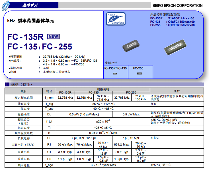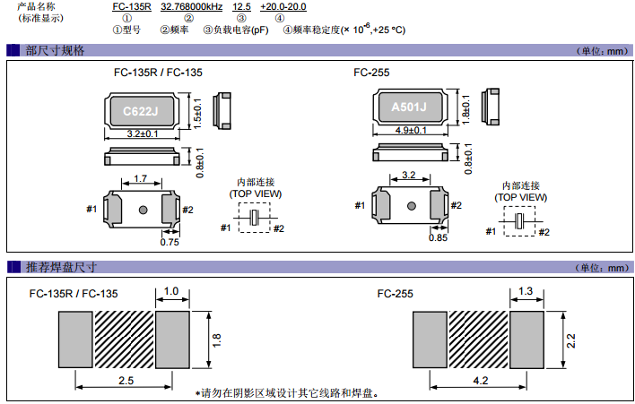 今天給大家來說說愛普生32.768khz貼片晶振中的一款老型號:FC-255。FC-255晶振應用范圍很廣闊,比如多種電子消費類,手機應用,藍牙多功能播放器,無線通訊產品,平板電腦等多個領域,FC-255因32.768KHZ晶體本身外觀款式多元化,所以適合多個產品應用.并且滿足歐盟ROHS環(huán)保要求,晶體本身有重量輕,體積小,超薄型等多種優(yōu)勢,得到市場認可。FC-255頻率范圍32kHz~100kHz,精度10PPM或20PPM或者指定,常用負載電容7PF,12.5PF,尺寸:4.9X1.8mm,FC-255可用于時鐘模塊,智能手機,全球定位系統(tǒng),因產品本身體積小,SMD編帶型,FC-255可應用于高性能自動貼片焊接,FC-255外觀尺寸具有薄型表面貼片型石英晶體諧振器,特別適用于有小型化要求的市場領域,比如智能手機,無線藍牙,平板電腦等電子數(shù)碼產品。當然FC-255逐漸被尺寸更小的FC-135替代是不爭的事實,下面南山電子就給大家分享下FC-255的規(guī)格書,以供大家選型參考: