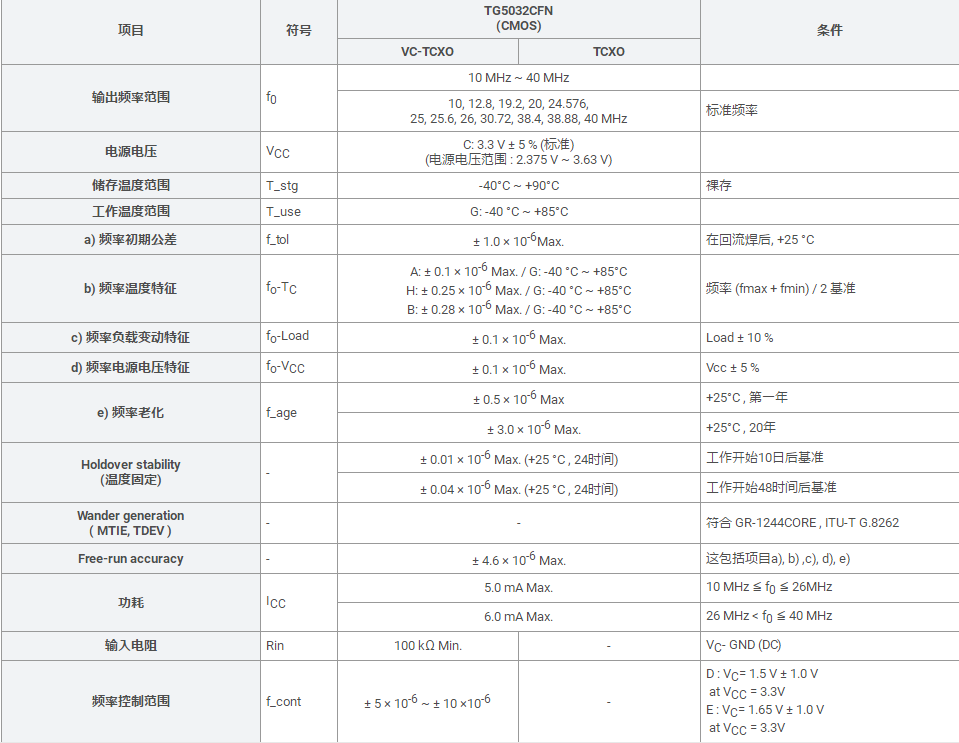 壓控溫補晶振TG5032CFN系列的工作電壓范圍寬泛,由于這種晶振具有較高的頻率穩(wěn)定度,而且體積小,在小電流下能夠快速啟動,非常適用于低電壓系統(tǒng)的設(shè)計。TG5032CFN還適用于寬溫范圍的電子數(shù)碼產(chǎn)品,家電電器及MP3,MP4,播放器,單片機等領(lǐng)域.可對應(yīng)8.000MHz以上的頻率,在電子數(shù)碼產(chǎn)品,以及家電相關(guān)電器領(lǐng)域里面發(fā)揮優(yōu)良的電氣特性。下面南山電子就給大家分享下TG5032CFN規(guī)格書以供大家選型參考: