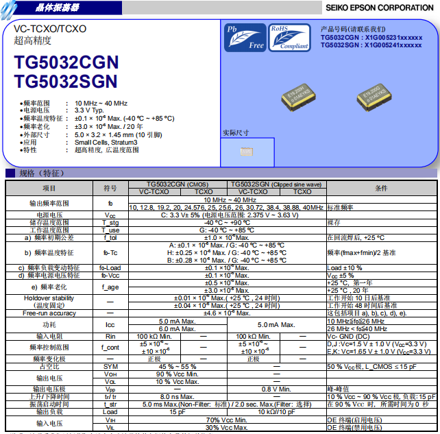 今天給大家介紹愛普生推出的壓控溫補(bǔ)晶振TG5032CGNTG5032SGN。這兩款都屬于VC-TCXO,TG5032CGN,TG5032SGN具有超高穩(wěn)定性,具有CMOS輸出和使用晶體基振的削波正弦波輸出形式。且有低相位噪聲優(yōu)勢,是溫補(bǔ)晶體振蕩器(TCXO)和壓控晶體振蕩器(VCXO)結(jié)合的產(chǎn)物,具有TCXO和VCXO的共同優(yōu)點(diǎn),性價(jià)比高,頻率溫度的穩(wěn)定度極好,溫度適應(yīng)能力強(qiáng),可在寬溫下穩(wěn)定工作。TG5032CGNTG5032SGN可提供10MHz~40MHz的頻率,具有超高輸出穩(wěn)定性,其頻率容差僅為±1.0X10-6;同時(shí),頻率受環(huán)境溫度、負(fù)載和電壓的影響均超小,在工作溫度(標(biāo)準(zhǔn))范圍內(nèi),其頻率/溫度特性僅為±0.10X10-6,且內(nèi)置的溫度補(bǔ)償功能,可有效抵抗晶振本身及外部環(huán)境的溫度變化,保證頻率輸出穩(wěn)定性。因此,TG5032CGN,TG5032SGN均適用于對頻率穩(wěn)定性有高要求的應(yīng)用場景。TG5032CGNTG5032SGN此系列VC-TCXO晶振的工作電壓范圍寬泛,非常適用于低電壓系統(tǒng)的設(shè)計(jì),使得用戶在有更多的選擇性,可用于常見的3.3V、5V電路設(shè)計(jì),由于這種晶振具有較高的頻率穩(wěn)定度,而且體積小,在小電流下能夠快速啟動(dòng),在低電壓系統(tǒng)中,應(yīng)用較多。說了那么多共同點(diǎn),那么TG5032CGNTG5032SGN這兩款壓控溫補(bǔ)晶振該如何識(shí)別,又有什么不同點(diǎn)呢?南山電子為大家一一解答,首先給大家分享下TG5032CGN,TG5032SGN規(guī)格書,以供大家選型參考: