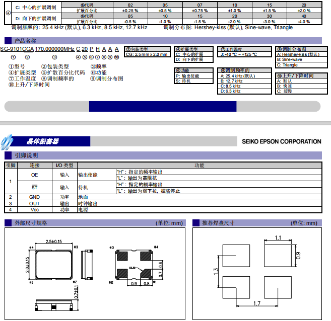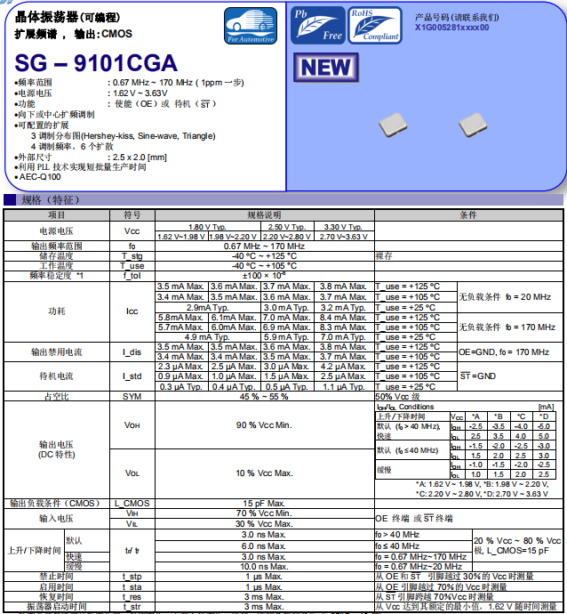 大家好,今天給大家介紹車規(guī)級(jí)晶振SG-9101CGA。首先SG-9101CGA屬于愛(ài)普生9101系列,是一款可編程晶振。SG-9101CGA車規(guī)級(jí)晶振采用2.5x2.0mm封裝,利用PLL技術(shù)生產(chǎn),此款振蕩器的頻率范圍從0.67M~170MHZ任一頻點(diǎn)可選,步進(jìn)1ppm,采用標(biāo)準(zhǔn)CMOS輸出,輸出負(fù)載為15pF,有良好的頻率穩(wěn)定性。SG-9101CGA系列車規(guī)級(jí)晶振采用低供電電壓,范圍為1.62V~3.63V,且具有低功耗特性。在25℃,1.8V/2.5V/3.3V下,SG-9101CGA空載電流消耗典型值分別為4.9mA /5.9mA /7.0mA。過(guò)ST端口可實(shí)現(xiàn)待機(jī)模式,進(jìn)一步降低設(shè)備的功率損耗。SG-9101CGA系列車規(guī)級(jí)晶振工作溫度范圍為-40℃~+125℃,無(wú)鉛,綠色環(huán)保,滿足汽車工業(yè)標(biāo)準(zhǔn)。另外,此款車規(guī)級(jí)晶振采用小尺寸貼片封裝,尺寸僅為2.5×2.0×0.7mm,能在對(duì)空間敏感的汽車電子應(yīng)用中更加得心應(yīng)手。SG-9101CGA功耗低至0.3μA,工作溫度高達(dá)125℃,符合RoHS要求和AEC-Q100標(biāo)準(zhǔn),適合應(yīng)用于汽車多媒體、車載導(dǎo)航系統(tǒng)和遙控鑰匙等車載電子設(shè)備。下面南山電子就給大家分享下車規(guī)級(jí)晶振SG-9101CGA的規(guī)格書(shū)以供大家選型推廣。