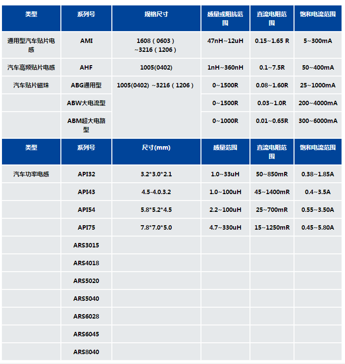 風(fēng)華汽車級電感常用規(guī)格燕通常有以下幾種:通用型車規(guī)電感AMI系列車規(guī)功率電感API系列,汽車級高頻電感AHF系列,車規(guī)磁珠ABG,ABW,ABM系列,具體規(guī)格參數(shù)如下圖所示: