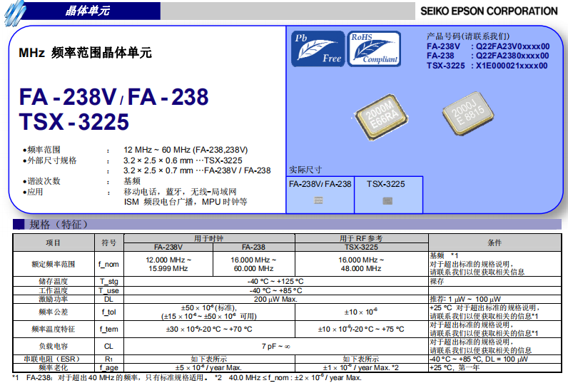 FA-238晶振,體積3.2*2.5*0.7mm。頻率范圍16-60MHZ。長(zhǎng)度兩腳間距1.2mm,寬度兩腳間距0.7mm。四腳均無斜角變化。腳位方向從貼片晶振正面左下方逆時(shí)針順序分別為1,2,3,4.