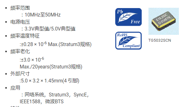 TG5032SFN應(yīng)用于:小型細(xì)胞,Stratum3,SyncE,IEEE1588。TG5032SCN應(yīng)用于:網(wǎng)絡(luò)系統(tǒng),Stratum3,SyncE,IEEE1588,微波BTS。
