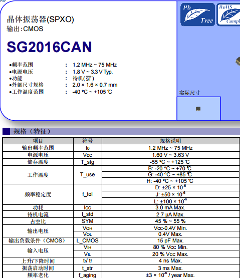 EPSON推出的2016有源晶振:SG2016CAN,是一款CMOS輸出的晶體振蕩器。頻率穩(wěn)定度可達(dá)±50PPM,頻率老化度僅為±3PPM/year,具有較高的穩(wěn)定性,滿足光模塊長期使用的要求。SG2016CAN封裝小,尺寸為2.0mm×1.6mm×0.7mm,光模塊體積小,采用2016有源晶振,更容易PCB設(shè)計。SG2016CAN的工作溫度范圍:-40℃~105℃,具有較高的工作溫度。5G前傳光模塊中,一般需要選擇寬溫的工作期間,所以所需的2016晶振也需要更高的溫度范圍,使用SG2016CAN可以滿足光模塊高溫的需求。下面南山電子就給大家看下這款2016有源晶振的規(guī)格書,以供大家選型參考: