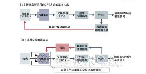 原來的方式采用燈光作為光源,在容納氣體單元的“空腔”容器上加載微波。當(dāng)空腔變小時(shí),長期頻率穩(wěn)定度就會(huì)降低,因此小型化存在限制。