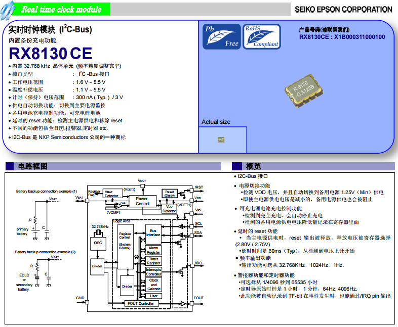 今天給大家來介紹一下愛普生晶振時鐘芯片模塊RX-8130CE,其特點是3225小尺寸和電池控制,可應用于可穿戴設備:RX-8130CE具有自動電源切換功能,可監(jiān)視電源電壓,并通過自動操作切換到備用電源,備用電源的開關電壓最小為1.25V。內置頻率可調的32.768kHz晶振單元,采用I2C總線接口,內置備用電池充電控制功能。RX-8130CE可支持頻率輸出,輸出頻率有32.768kHz、1024Hz、1Hz可選。且RX-8130CE還支持如完整的日歷、鬧鐘、定時器等功能。定時器的計時范圍為1/4069 s~65535 h,定時器的時鐘源為1小時、1分鐘、64Hz、4096Hz。定時器在事件發(fā)生時將自動記錄到TF寄存器位,并可以用/ IRQ引腳輸出。RX8130CE 的備用電源漏電流很低,最大不超過5nA,工作溫度范圍為-40~85℃,可適用于工業(yè)級設計。下面我們來看下RX-8130CE規(guī)格書以供大家選型參考: