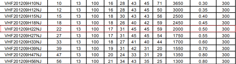 對比后發(fā)現(xiàn),在測試頻率100MHz的情況下,兩者飽和電流均為300mA,VHF160808H22NJT的自諧振頻率Min2000MHz,直流電阻Max0.6Ω,VHF201209H22NJT的自諧振頻率Min1700MHz,直流電阻Max0.5Ω,所以說如果自諧振頻率在2000以上兩者都可以,在1700—2000MHz時,只能用VHF201209H22NJT。