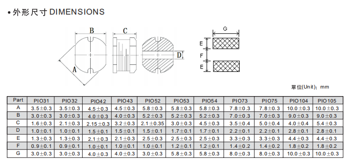 如上圖所示,PIO功率電感的外形尺寸,規(guī)格,精度等大家基本了解了,進一步飽和電流,測試電壓等可以具體咨詢我們南山電子??梢钥吹?,PIO31/32/42/43/52/53/54/73/75/104/105其實等同于CD31/32/42/43/52/53/54/73/75/104/105
