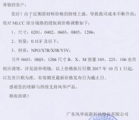 自2016年第三季度至今,被動(dòng)元件價(jià)格持續(xù)上漲,至今已經(jīng)有過(guò)幾輪,風(fēng)華電容近日又再一次向各代理商下方了統(tǒng)一漲價(jià)通知,最新價(jià)格生效時(shí)間為2017年10月1日。產(chǎn)品主要涉及 MLCC 和 R...