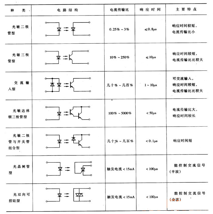 表:常見光電耦合器的電路結(jié)構(gòu)及特性