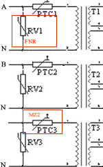 熱敏電阻和T1初級(jí)串聯(lián)的回路中的電流為電表正常的電流。當(dāng)輸入電壓變大時(shí)(一般是接地故障),熱敏電阻和T1初級(jí)串聯(lián)的回路中的電流也將變大,當(dāng)此電流達(dá)到或超過(guò)熱敏電阻的動(dòng)作電流時(shí),熱敏電阻將動(dòng)作,熱敏電阻阻值會(huì)變大,而阻值變大的速度取決于此時(shí)電流的大小,電流越大,速度越快。當(dāng)熱敏的阻值變大時(shí),由歐姆定律I=U/R,可以得出整個(gè)回路的電流將變小。