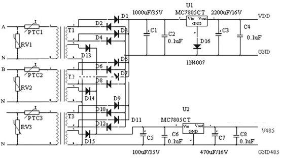 變壓器對(duì)各相的電壓進(jìn)行變壓,然后通過(guò)整流穩(wěn)壓電路對(duì)電表供電。