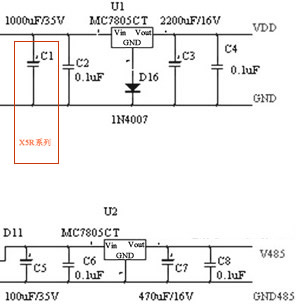 電容會(huì)有充電、放電的過(guò)程。這樣,整流后的信號(hào)將產(chǎn)生如下變化。變?yōu)檫B續(xù)的更接近 直流的電壓。C5是對(duì)D13(485繞組)整流后的波形進(jìn)行濾波。C3、C7分別對(duì)U1、U2輸出的電壓進(jìn)行濾波:使波形更 穩(wěn)定。