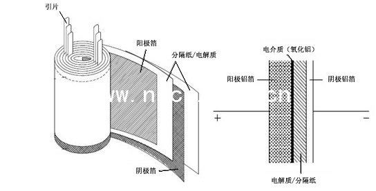電解電容包含兩個(gè)導(dǎo)電電極,中間有絕緣層隔開。一個(gè)電極(陽極)由擴(kuò)大了表面積的鋁箔形成。鋁氧化層(AL2O3)在其表面形成絕緣層。與其它電容相比,
