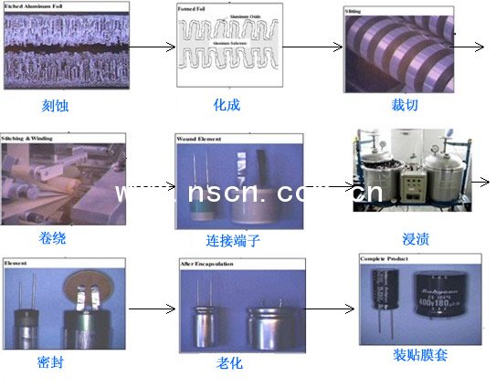 陽極和陰極金屬箔是由高純度的,很薄的只有0.02—0.1mm鋁箔做成的,為了增加盤面積和電容量,與電解液接觸的表面積的增加是通過蝕刻金屬箔去溶解鋁,使整個(gè)鋁箔的表面形成一個(gè)高密度的網(wǎng)狀的有幾十億個(gè)精細(xì)微管道的結(jié)構(gòu)。蝕刻技術(shù)是牽引在滾筒上的鋁箔通過氯化物溶液,并且在蝕刻溶液和鋁箔之間加AC,DC或AC-&-DC電壓。表面面積對(duì)于低壓電容來說可以增加100倍,對(duì)于高壓電容來說可以增加20-25倍。