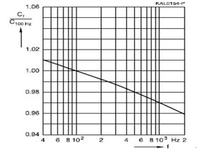 電解電容的容量隨著測試頻率的升高而降低。電解電容容量-頻率特性曲線如下圖所示: