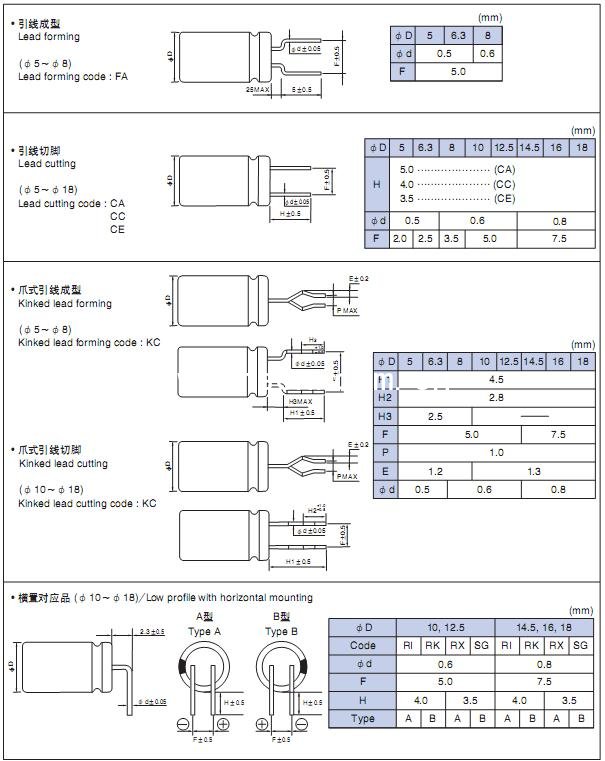 鋁電解電容器封裝按安裝方式分類有以下幾種:引線型、牛角型、貼片型、螺絲型等;按本體形狀分類由于其結(jié)構(gòu)特點(diǎn)決定了常用的就只有圓柱形一種。常用的為標(biāo)準(zhǔn)引線型。