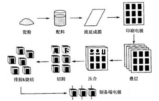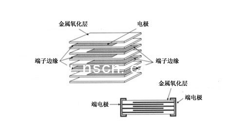內(nèi)電極導(dǎo)體一般為Ag或AgPd,陶瓷介質(zhì)一般為BaTiO3, 多層陶瓷結(jié)構(gòu)通過(guò)高溫?zé)Y(jié)而成。器件端頭鍍層(外電極)一般為燒結(jié)Ag/AgPd,然后制備一層Ni阻擋層(以阻擋內(nèi)部Ag/AgPd材料,防止其和外部Sn發(fā)生反應(yīng)),再在Ni層上制備Sn或SnPb層用以焊接。近年來(lái),也出現(xiàn)了端頭使用Cu的MLCC產(chǎn)品。