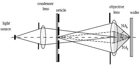 光刻的原理起源于印刷技術中的照相制版,是在一個平面上加工形成微圖形。隨著器件尺寸的不斷縮小,光刻技術也從最初的接觸式、接近式曝光發(fā)展到目前普遍使用的投影式曝光,圖1是投影式曝光示意圖。投影式曝光技術中由于硅片和掩膜版沒有接觸,從而避免了由于接觸引入的工藝缺陷,同時掩膜版的利用率得以提高,因此,該曝光技術成為了目前光刻技術的主流。