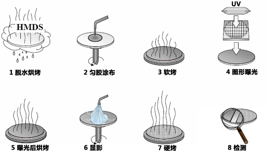 對于正性光刻膠,為了獲得平坦而均勻的光刻膠涂層并且使光刻膠與晶圓之間有良好的粘附性,通常在涂膠之前必須對晶圓進行預處理。預處理的第一步常常是一次脫水烘烤,在真空或干燥氮氣的氣氛中,以150~200℃烘烤。該步的目的是除去晶圓表面吸附的水分,在此溫度下,晶圓表面大概保留下一個單分子層的水。