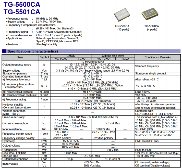 大家好,今天給大家介紹下用于電力同步網(wǎng)絡(luò)對(duì)時(shí)系統(tǒng)高精度溫補(bǔ)晶振TCXO:TG-5501CA。TG-5501CA是一款超高精度溫補(bǔ)晶振,常用的TG-5501CA 50MHz的料號(hào):X1G003901009700TG-5501CA是常用外部尺寸7050的TCXO晶振,TG-5501CA的頻率范圍從10.0MHz到50.0MHz,電源電壓2.7V ~ 5.5V,外部尺寸7.0*5.0*1.5mm,工作溫度-40~+85℃,TG-5501CA適合用于GPS,以及衛(wèi)星通訊系統(tǒng),智能電話等多用途的高穩(wěn)定的頻率溫度特性晶振。TG-5501CA低電壓?jiǎn)?dòng)功率,并且有多種電壓供選擇,比如有3.3V,3.8V,5V等,貼片晶振被廣泛應(yīng)用于,平板筆記本,GPS系統(tǒng),光纖通道,千兆以太網(wǎng),串行ATA,串行連接SCSI,PCI-Express的SDH / SONET發(fā)射基站等領(lǐng)域。老規(guī)矩,南山電子再次給大家分享TG-5501CA的規(guī)格書供大家選型參考: