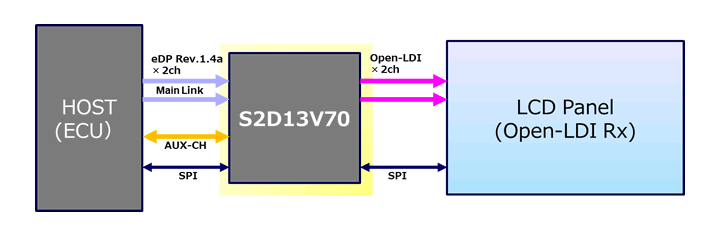 S2D13V70是用于Open LDI橋接器的eDP(rev.1.4a),可通過Open LDI接口實(shí)現(xiàn)eDP源與顯示面板之間的連接。它可以通過1通道/ 2通道eDP接收1.62Gbps / 2.7Gbps的數(shù)據(jù)速率,并將其轉(zhuǎn)換為2ch開放LDI信令進(jìn)行傳輸,像素時(shí)鐘頻率高達(dá)148.5MHz(每1ch)。該規(guī)范非常簡單,因此可以輕松地將其插入到現(xiàn)有的系統(tǒng)顯示架構(gòu)中,而無需進(jìn)行較少的修改,使其成為現(xiàn)有和未來設(shè)計(jì)的理想解決方案.S2D13V70還通過了包括AEC-Q100認(rèn)證和多種功能安全性在內(nèi)的汽車設(shè)計(jì)認(rèn)證。
