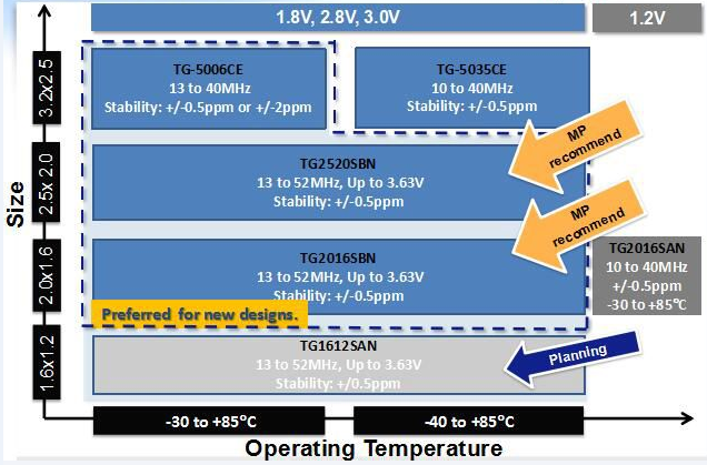 雖然說溫補(bǔ)晶振既無恒溫電路,也無感溫頭,焊接歪曲是有可能的,但也不是這樣粗制濫造的啊,這還是高精度元件嗎?愛普生溫補(bǔ)晶振相比其他的在-40~﹢85℃下穩(wěn)定提供0.5ppm的高精度,這樣子的明顯是市場流出的山寨貨,大家一定要注意,切勿貪小便宜吃大虧,下面我們來看下愛普生溫補(bǔ)晶振幾款主力型號選型示意圖: