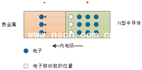 在內(nèi)電場的作用下,貴金屬端的電子漂移至N型半導(dǎo)體。隨著漂移運動,內(nèi)電場又逐漸被削弱,擴(kuò)散運動增加。最后擴(kuò)散運動與漂移運動達(dá)到平衡,在N型半導(dǎo)體與貴金屬之間形成了Schottky barriers(肖特基勢壘)。如下圖。