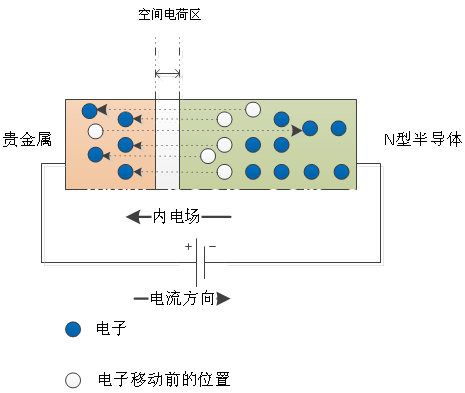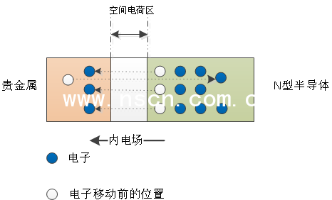 Schottky diode 是用貴金屬作為正極,N型半導(dǎo)體作為負(fù)極。在N型半導(dǎo)體中摻雜了磷、砷等元素,所以N型半導(dǎo)體的多子為自由電子(Electronics),少子為空穴(Hole)。而貴金屬中的自由電子較少,所以電子(Electronics)由N型半導(dǎo)體向金屬擴(kuò)散。因為金屬中沒有空穴(Hole)的存在,所以當(dāng)電子不斷向金屬擴(kuò)散,N型半導(dǎo)體得不到空穴補充所以帶正電,貴金屬端由于多了自由電子所以帶負(fù)電。Schottky diode 就形成了一個從N型半導(dǎo)體指向貴金屬端的內(nèi)電場。如下圖。