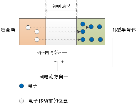 當(dāng)對肖特基二極管施加反向電壓時,在反向電壓與內(nèi)電場的共同作用下空間電荷區(qū)增加,擴(kuò)散運動受抑。少量電子在外加電壓與內(nèi)電場的共同作用下從貴金屬端漂移至N型半導(dǎo)體。N型半導(dǎo)體的電子因為空間電荷區(qū)的增大以及外加電場與內(nèi)電場共同的影響無法穿過空間電荷區(qū)到達(dá)貴金屬端,形成反向截止。